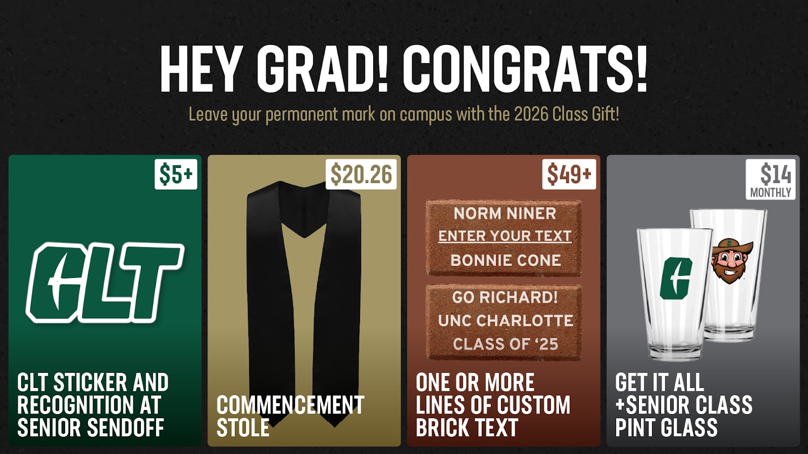 The Graduate Class of 2025-2026 can shape what’s next at Charlotte. A donation means you’re investing and paving the way for future Niners!