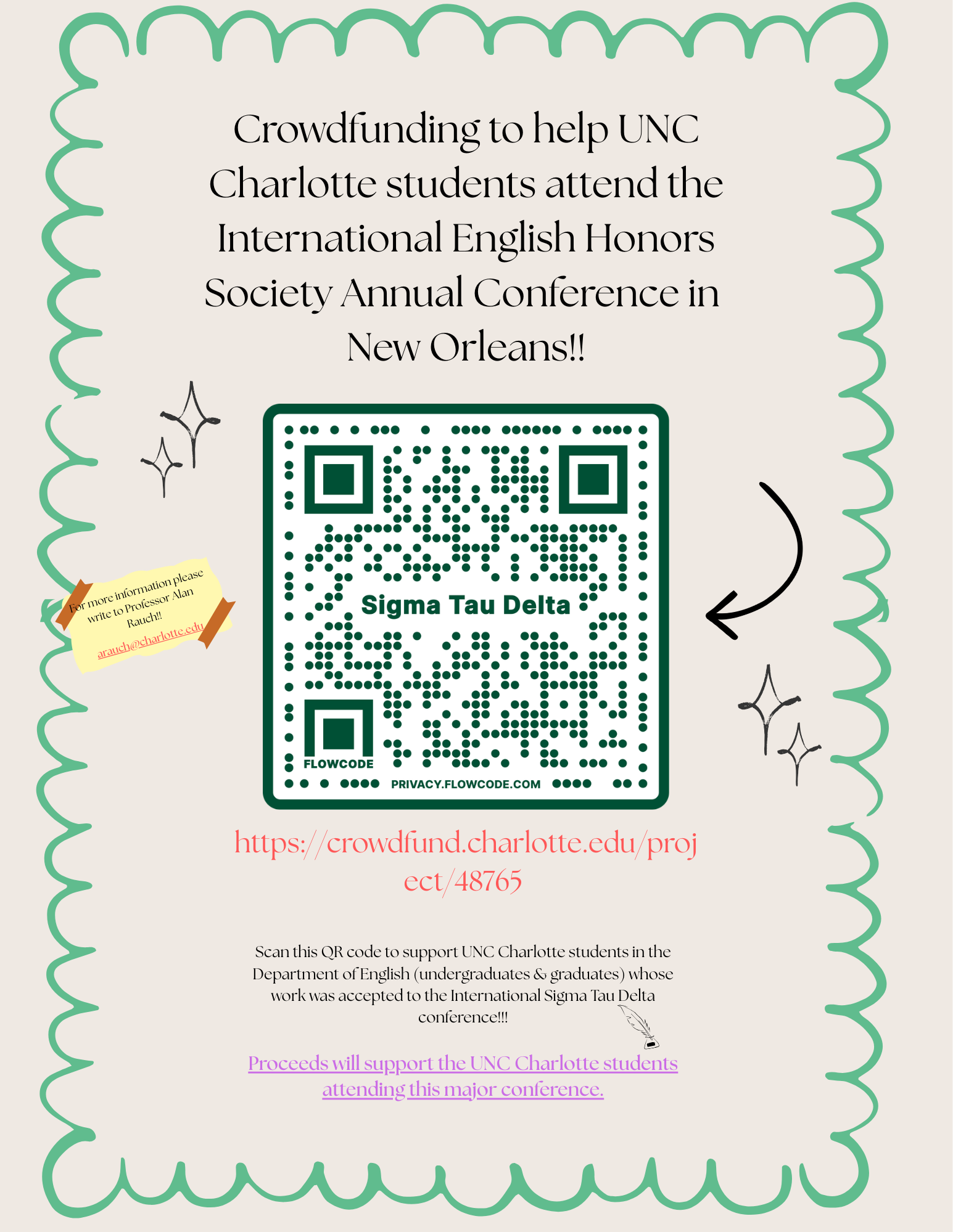 On behalf of the 10 students who are set to attend the 2026 Sigma Tau Delta Conference in New Orleans, we want to say thank you for everyone's unyielding support. We continue to receive donations from family, friends, and mentors as they support our endeavor to fund our conference trip to New Orleans. In order to reach a wider audience we have made a flyer containing a QR code that will take everyone to our crowdfunding page by simply scanning it. Next to the QR code is a list of students' critical and creative pieces that were accepted to this conference! Feel free to share these flyers with local businesses, your work establishments, or anyone that you think would support our project.