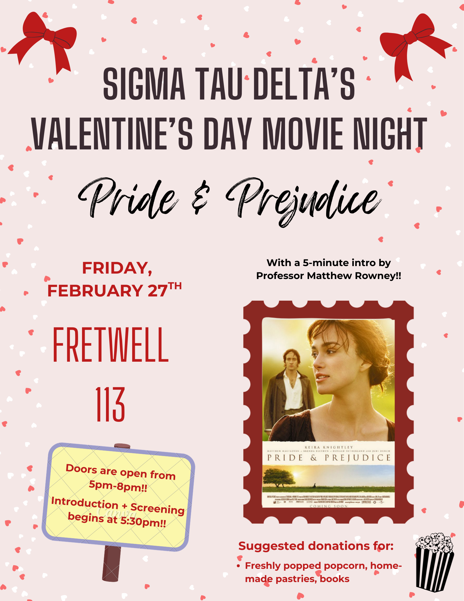 Join us as we show the 2005 film adaptation of Jane Austen's 1813 novel Pride & Prejudice with a 5-minute introduction by Professor Matthew Rowney!! Suggested donations will be available for these concessions throughout the duration of the movie: